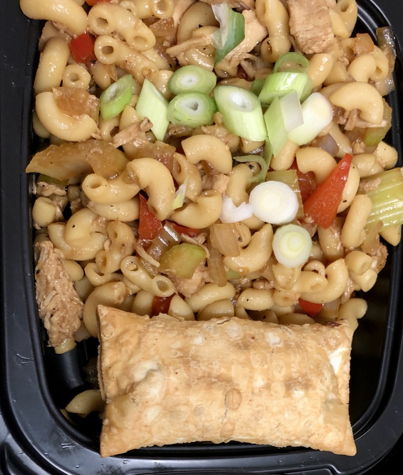 macaronis, poulet, poivrons, céleri, oignon, sauce soja, épices , sirop d'érable, porc, vermicelle de riz, carotte