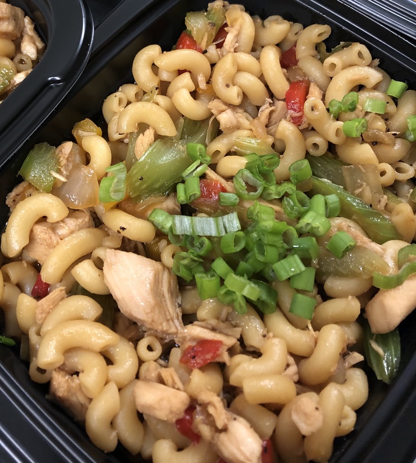 macaronis, poulet, poivrons, céleri, oignon, sauce soja, épices , sirop d'érable
